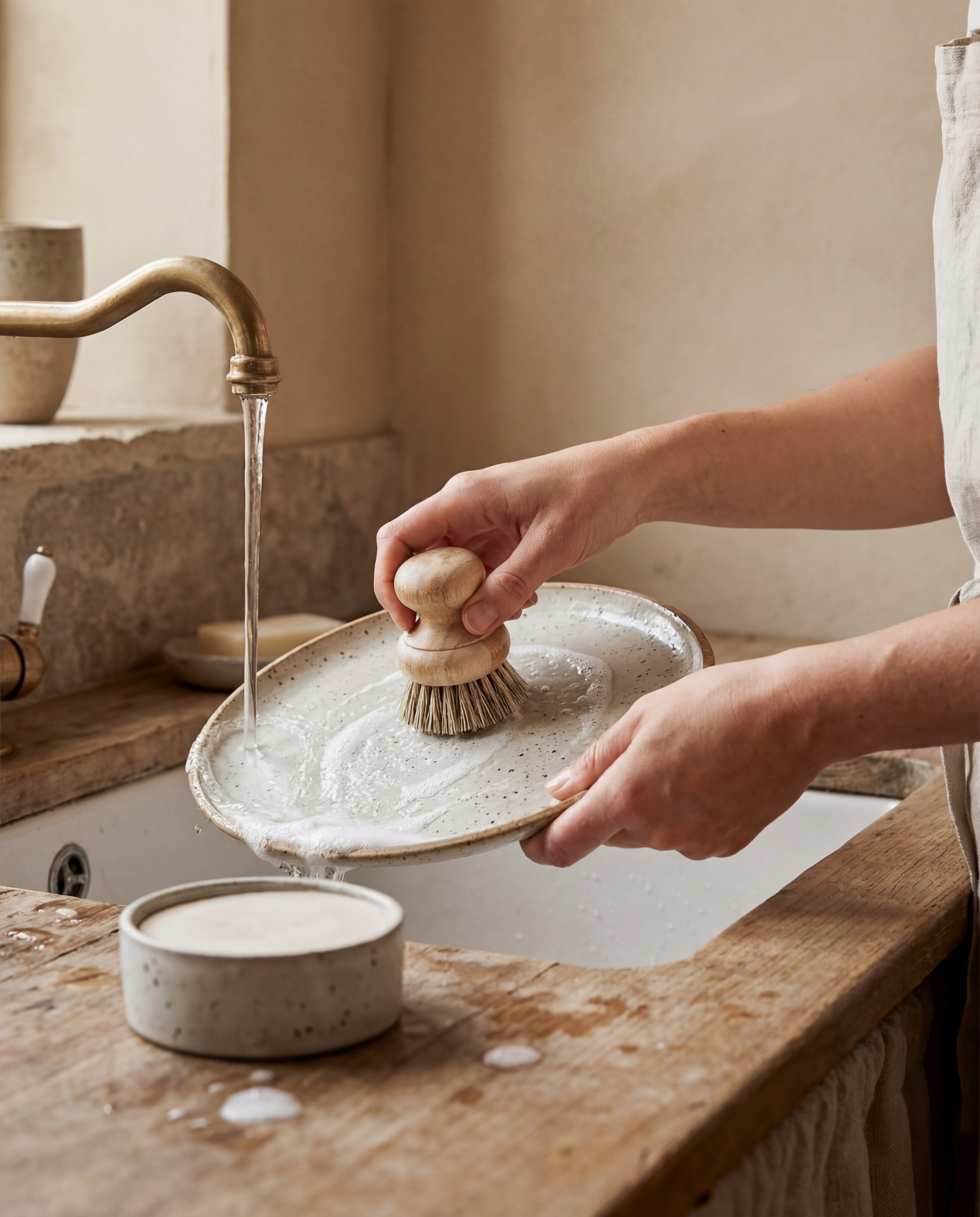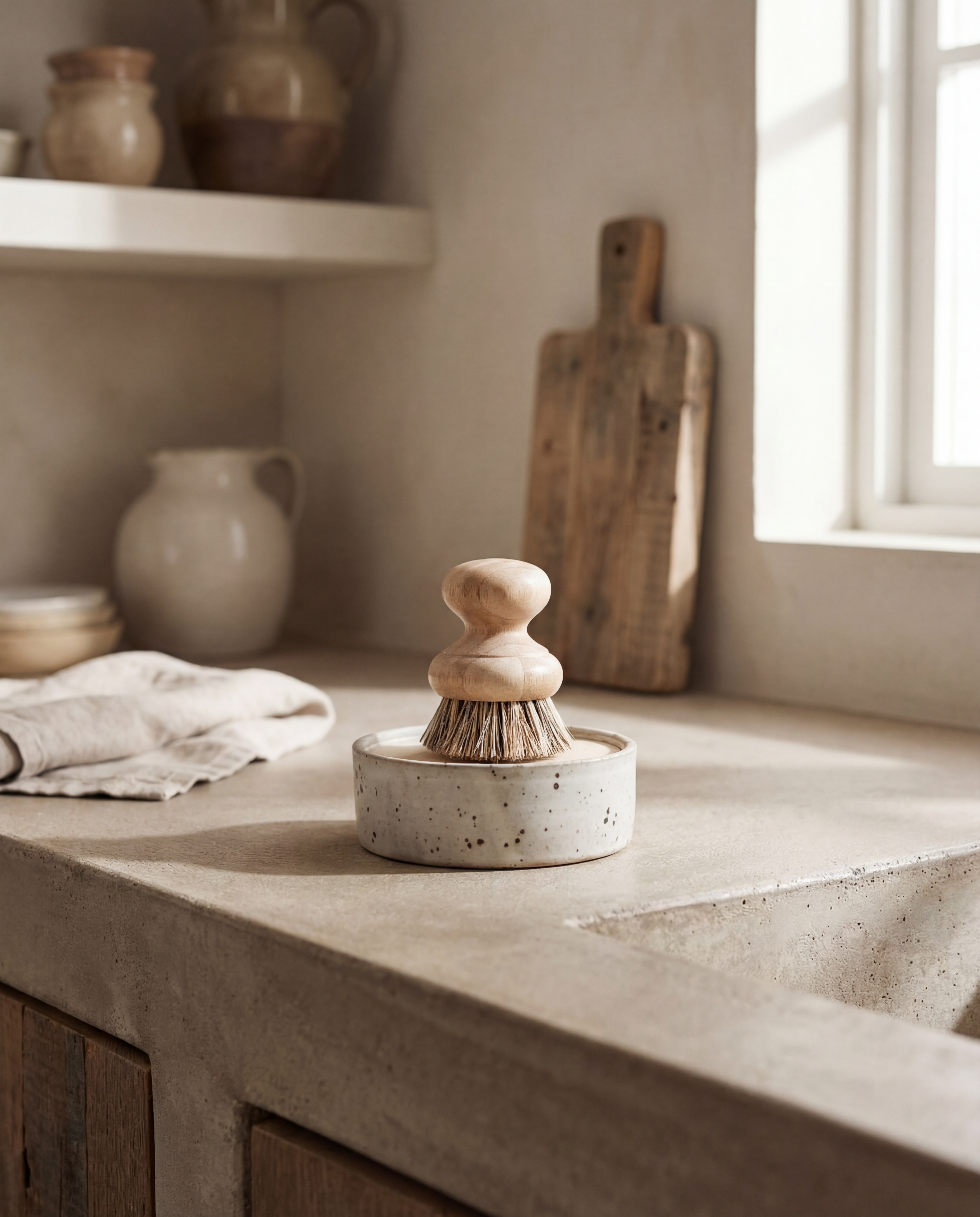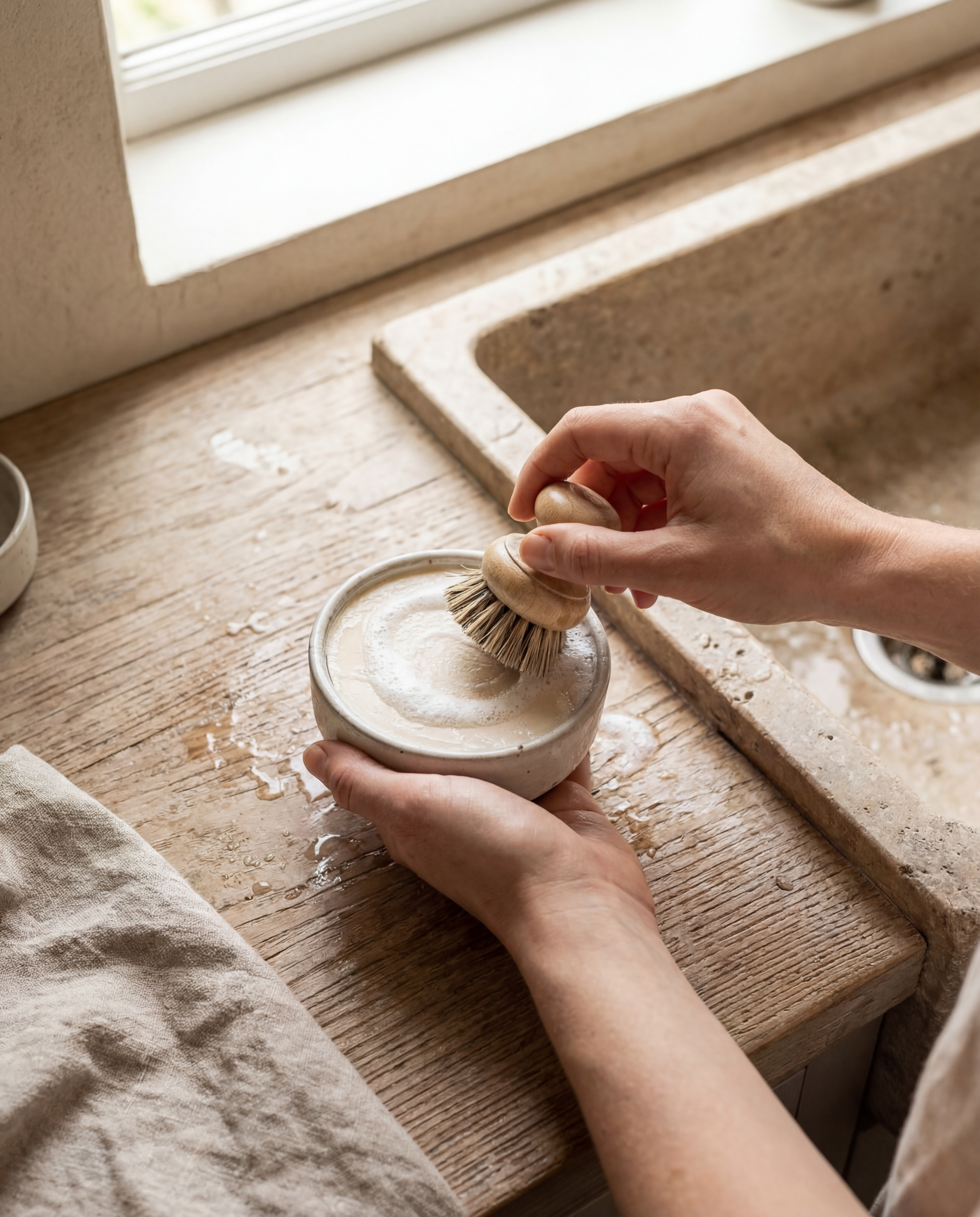 Dish paste is a concentrated alternative to liquid dish soap. Instead of squeezing product into the sink, you lightly load a wet sponge or brush directly from the paste. Because it contains far less water, it lasts much longer and creates less waste.
